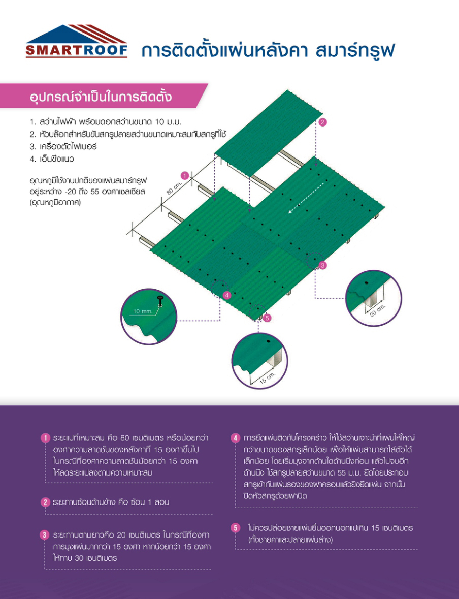 ติดตั้งง่ายเนื่องจากมีขนาดแผ่นที่ใหญ่กว่า มีรอยต่อน้อย สะดวกต่อการติดตั้ง ช่างสามารถเหยียบบนแผ่นได้ขณะติดตั้ง เพราะแผ่น SmartRoof มีความแข็งแรง จึงไม่ทำให้แตกหัก หรือ เสียรูปทรง แผ่นหลังคา SmartRoof มีสีที่สดและสวยงามให้เลือกถึง 5 สี และไม่จำเป็นต้องติดตั้ง ฉนวนกันความร้อนเพิ่ม เนื่องจากเป็นฉนวนในตัวอยู่แล้ว มีน้ำหนักเบา จึงช่วยประหยัดโครงสร้าง และนอกจากนี้ Sealing Cap ซึ่งเป็นวัสดุส่วนเสริมที่ช่วยปกป้องหัวน็อตสกรู ไม่ให้โดนน้ำ ลดการเกิดสนิมและยังเป็นตัวช่วยล็อกกลอนของแผ่นให้หนายิ่งขึ้น