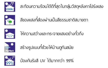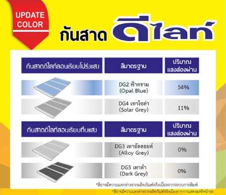 • กันสาดดีไลท์ (กันสาดดีไลท์ ลอนเรียบ) มีให้เลือก 4 สี เป็นวัสดุที่ให้แสงสว่างธรรมชาติส่องผ่านเข้าสู่ภายในบ้าน หรืออาคาร พร้อมออกแบบแผ่นให้สามารถลดความลาดเอียงน้อยสุด ป้องกันการรั่วซึม ให้ความทันสมัยเรียบหรู และแข็งแรงสามารถตอบโจทย์ทุกฟังก์ชั่น และดีไซน์ของกันสาดได้อย่างลงตัว เหมาะกับอาคารที่พักอาศัย กันสาดหน้าบ้าน โรงจอดรถ หลังคาคลุมสระว่ายน้ำหรือส่วนอื่นๆ ที่ต้องการความสวยงามทันสมัย